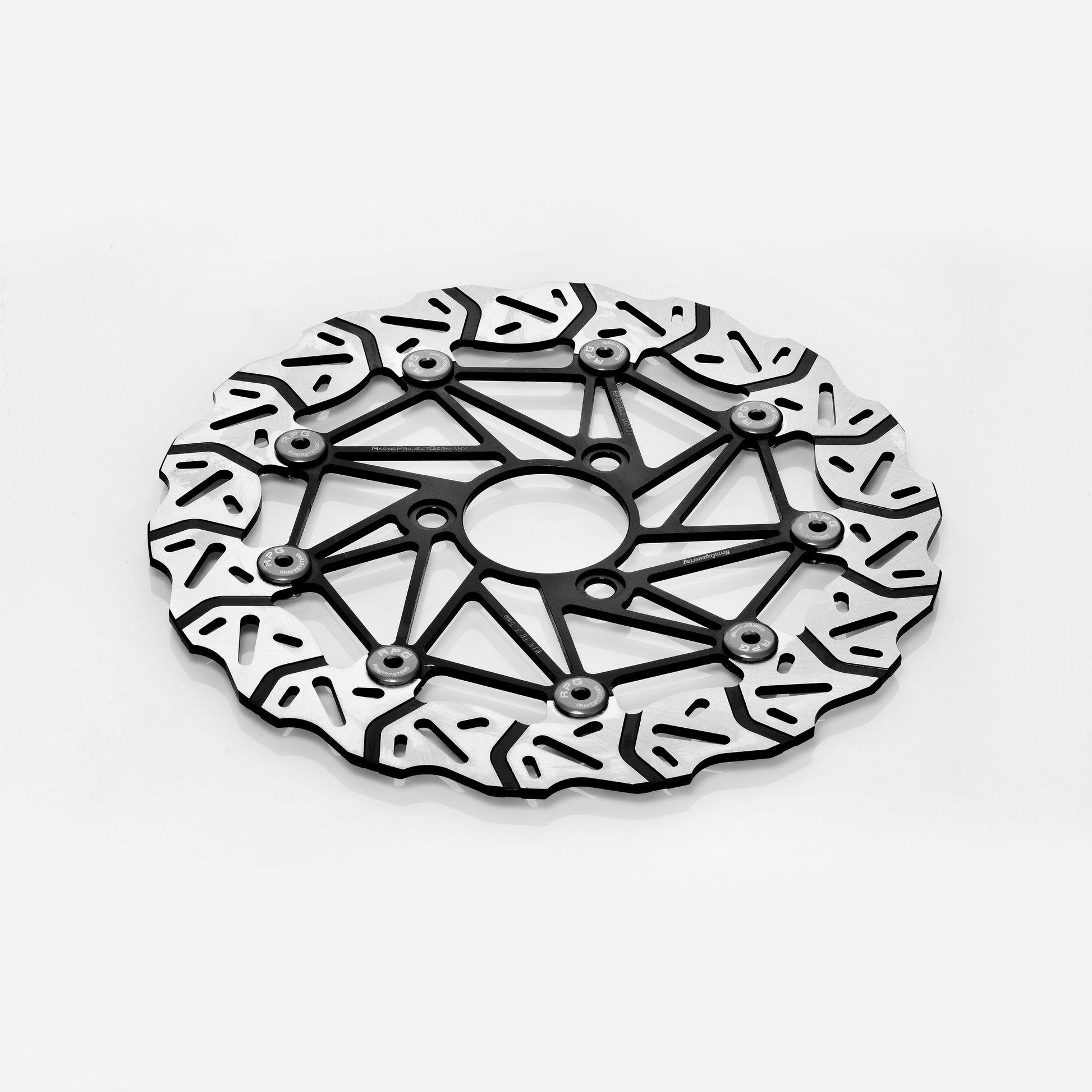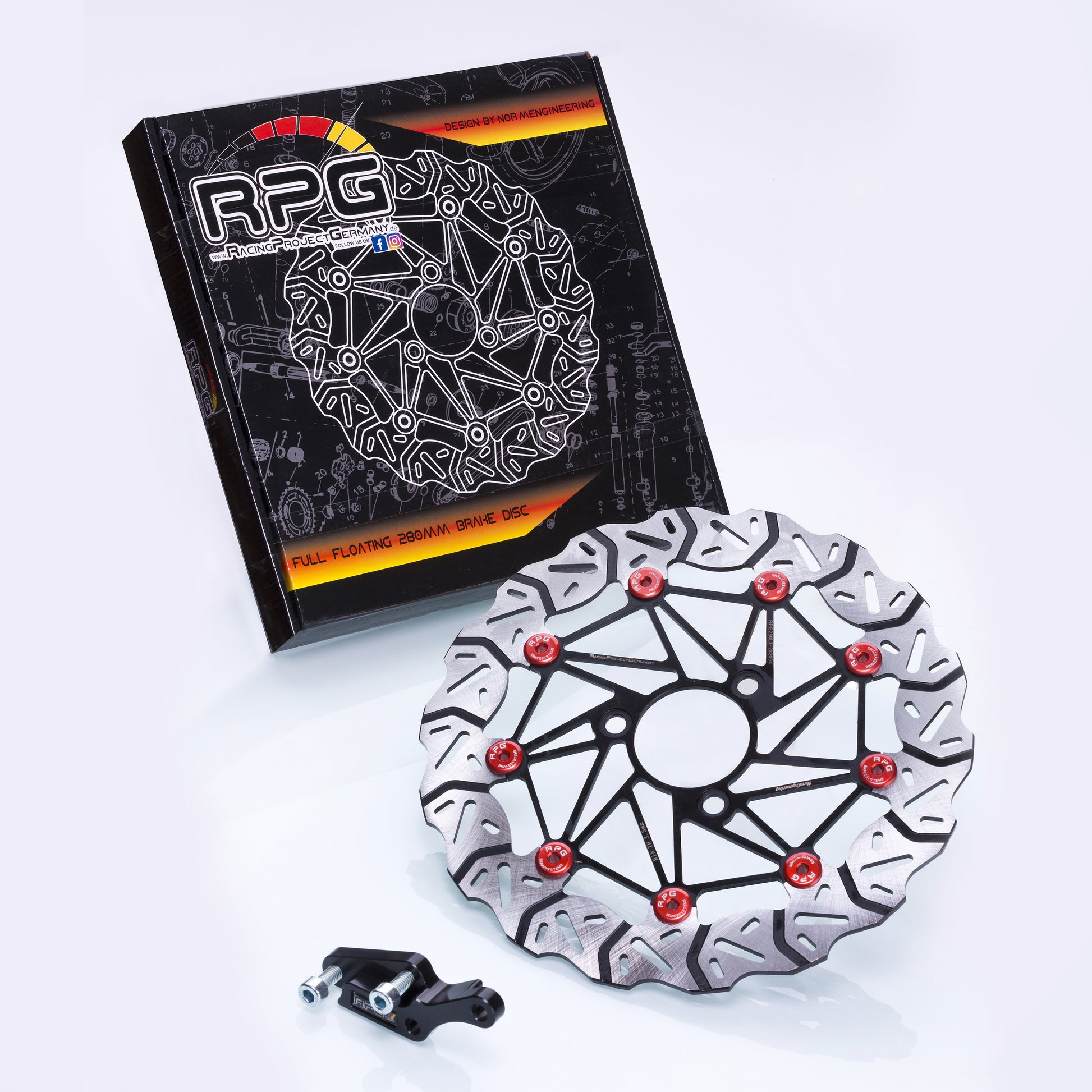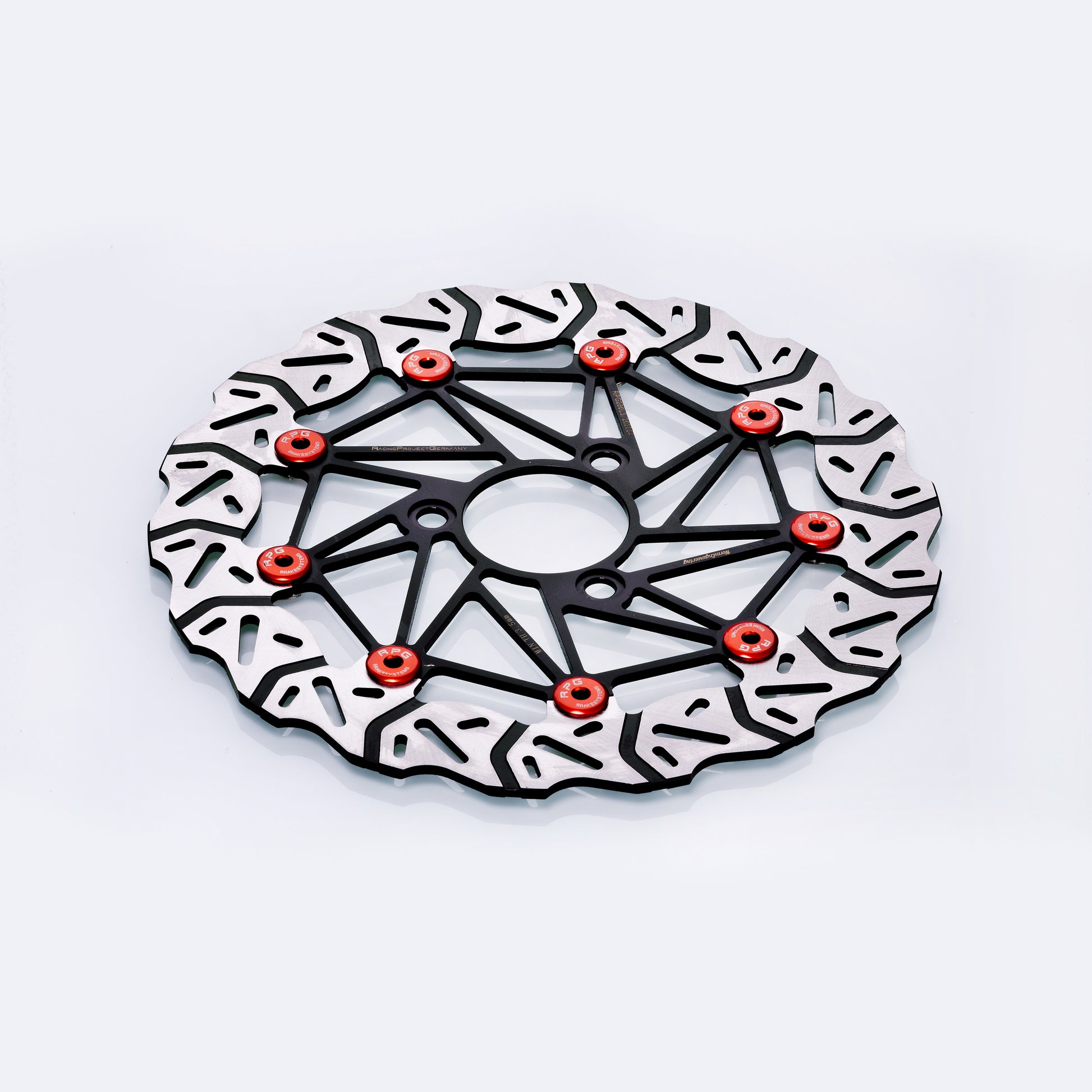 RPG 280mm Oversize Bremsscheibe im Wave-Design mit orange eloxierten voll schwimmenden Floatern und schwarz pulverbeschichtetem Träger.